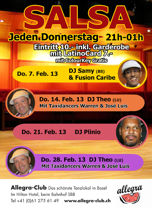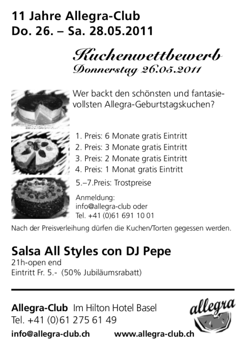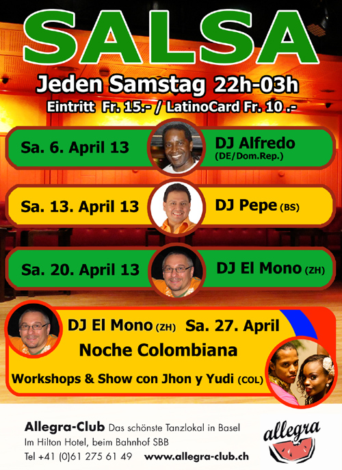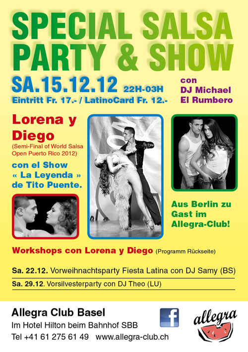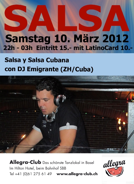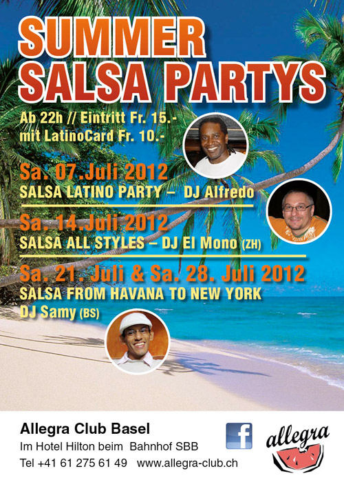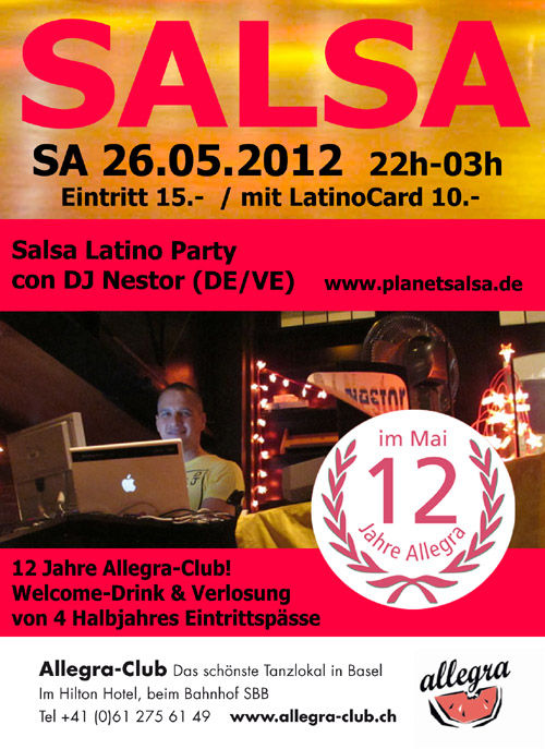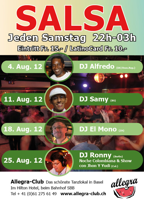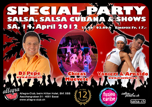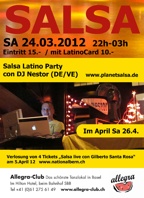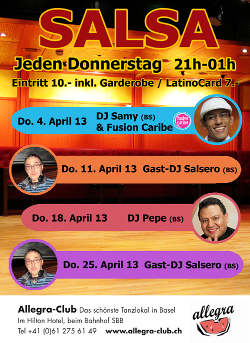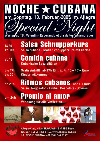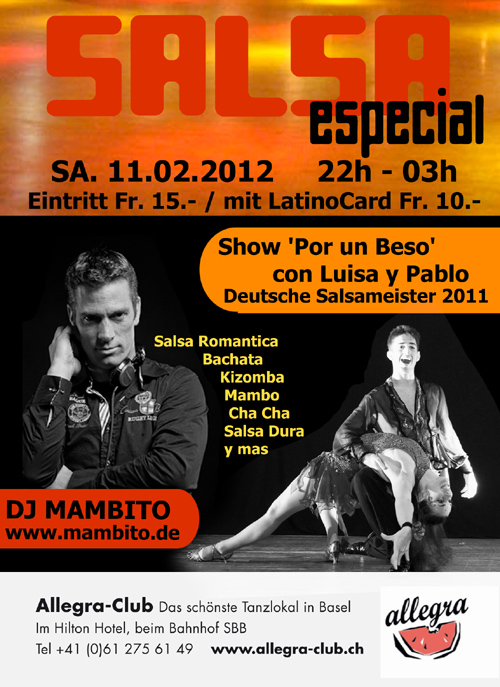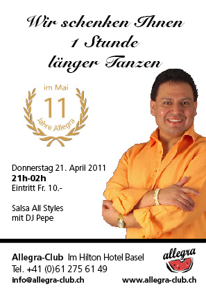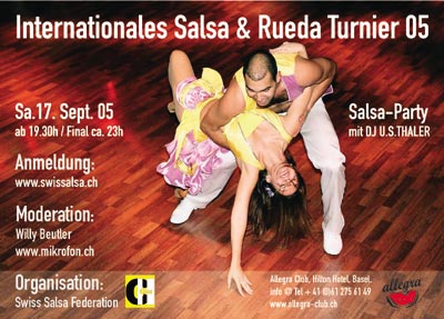 von 4 Salsa-Tanzschulen aus Basel Erstmals in Basel treten zum 5jährigen Jubiläum des Allegra-Clubs am Donnerstag, 26. Mai 2005, vier der wichtigsten Salsa-Tanzschulen der Region an einer gemeinsamen Veranstaltung auf. Jede Schule wird mit ihrer neusten Choreografie ihr Können unter Beweis stellen und zeigen, wie stark das Salsa-Virus in Basel verbreitet ist… doch Vorsicht: es könnte ansteckend sein! Die vier teilnehmenden Salsa-Tanz-Schulen sind: