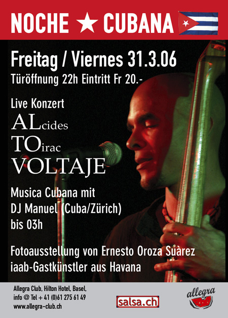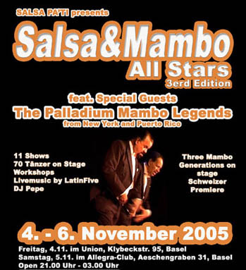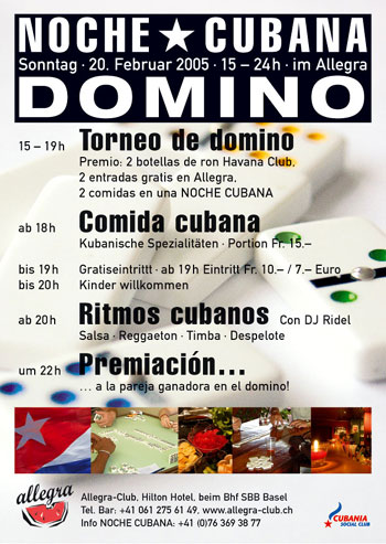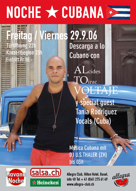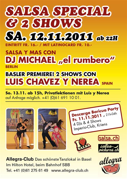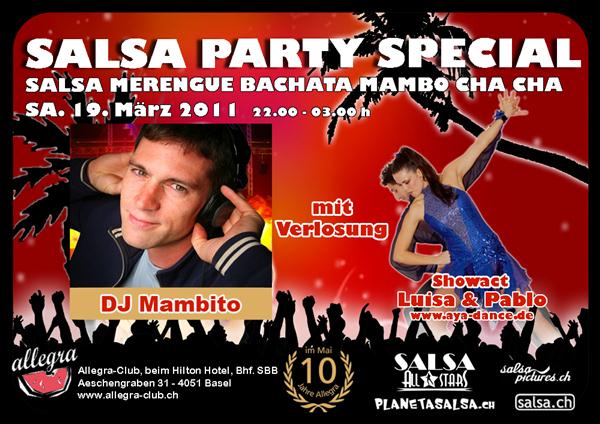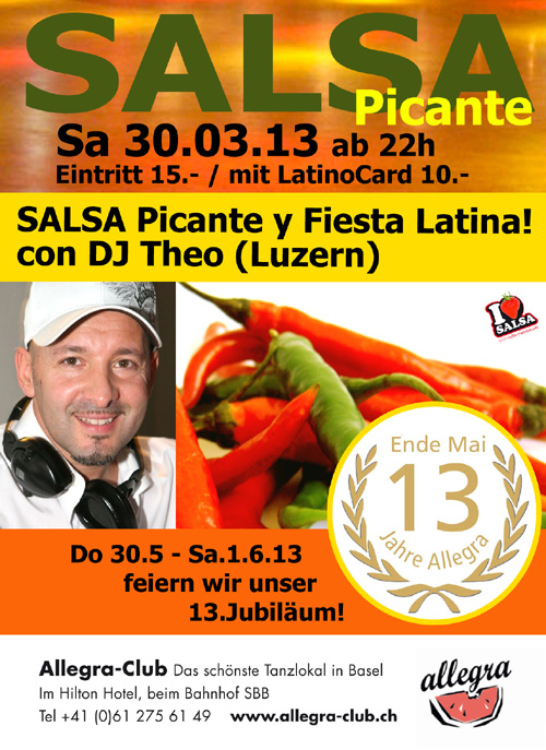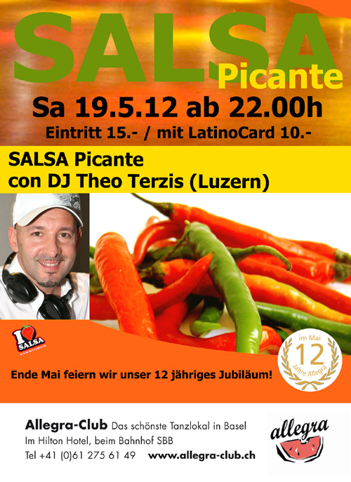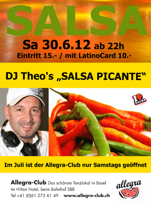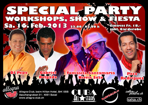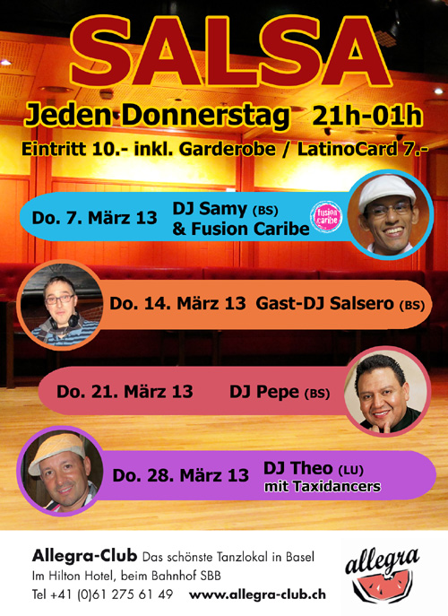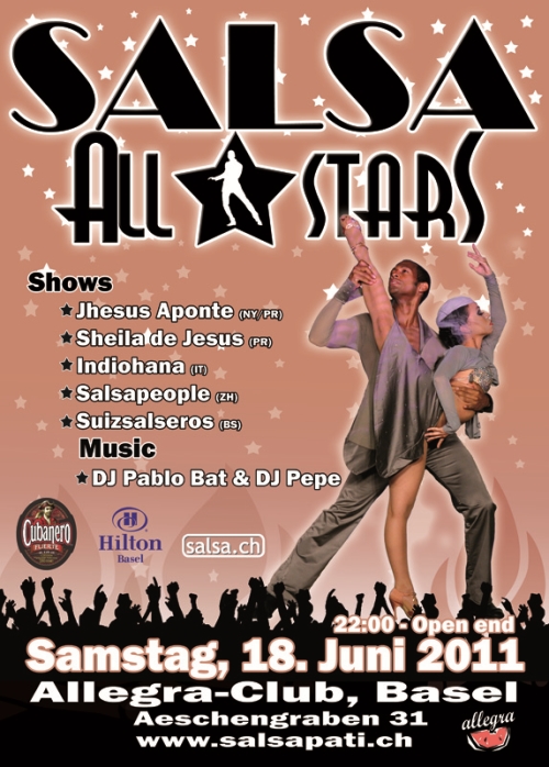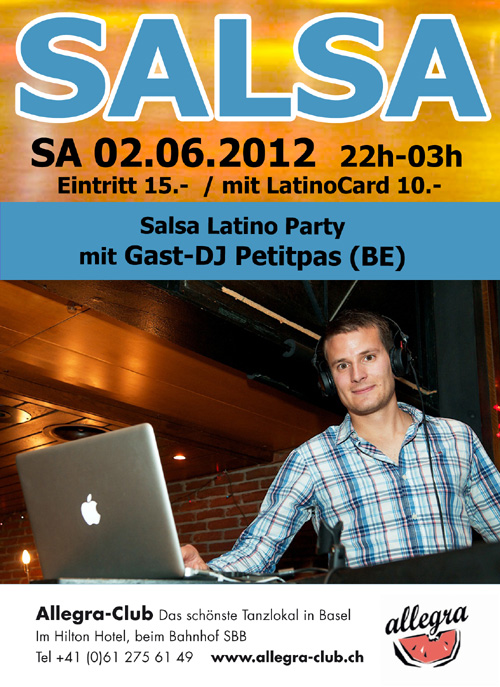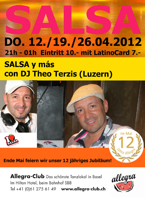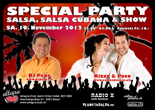 von 4 Salsa-Tanzschulen aus Basel Erstmals in Basel treten zum 5jährigen Jubiläum des Allegra-Clubs am Donnerstag, 26. Mai 2005, vier der wichtigsten Salsa-Tanzschulen der Region an einer gemeinsamen Veranstaltung auf. Jede Schule wird mit ihrer neusten Choreografie ihr Können unter Beweis stellen und zeigen, wie stark das Salsa-Virus in Basel verbreitet ist… doch Vorsicht: es könnte ansteckend sein! Die vier teilnehmenden Salsa-Tanz-Schulen sind: