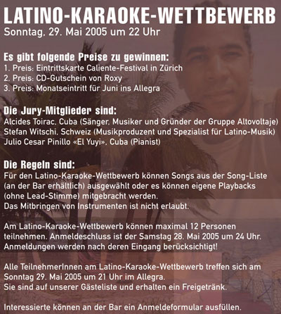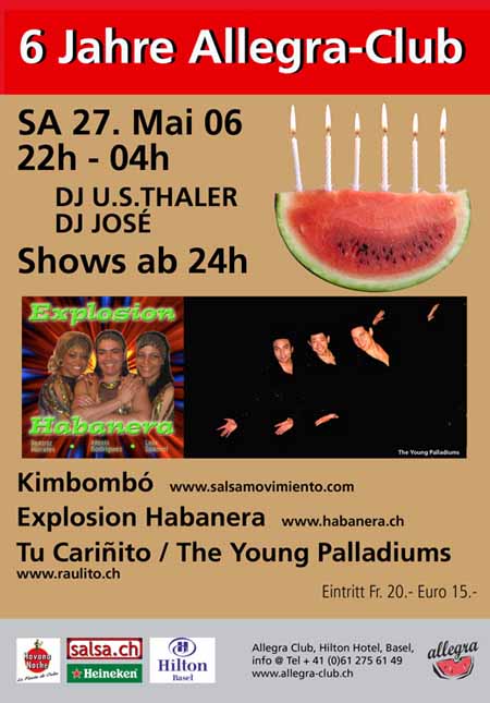 Pfingstwochenende und div. Grossanlässe, deshalb feiern wir im kleinen Rahmen und spendieren an der Verlosung 4 Halbjahres Eintrittspässe, d.h. von Juli-Dez. 2012 Gratis Eintritt an all unsere Veranstaltungen. Zusätzlich 2 Tickets für das Konzert von „Rubén Blades“ (11.7. in ZH), Sponsor ist www.allblues.ch . Herzlichen Dank für das Sponsoring. Wir geben weiterhin unser BESTES und freuen uns auf viele treue und neue Gäste. ![]() |