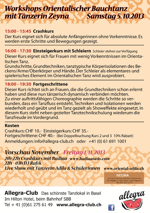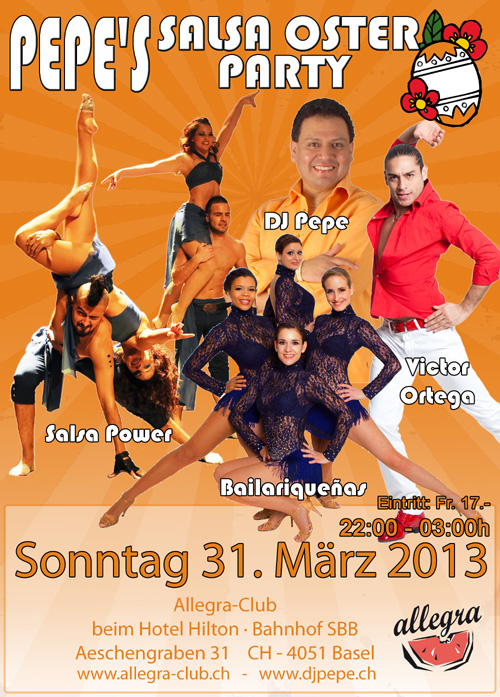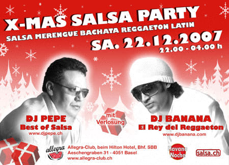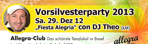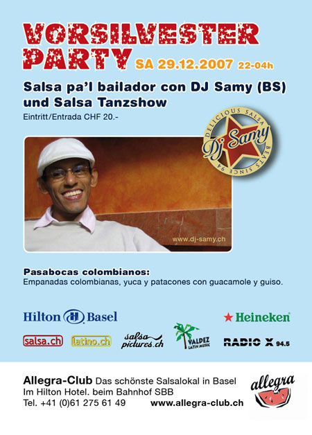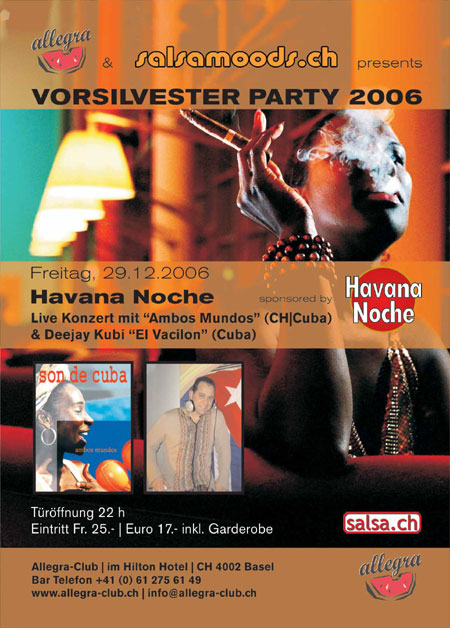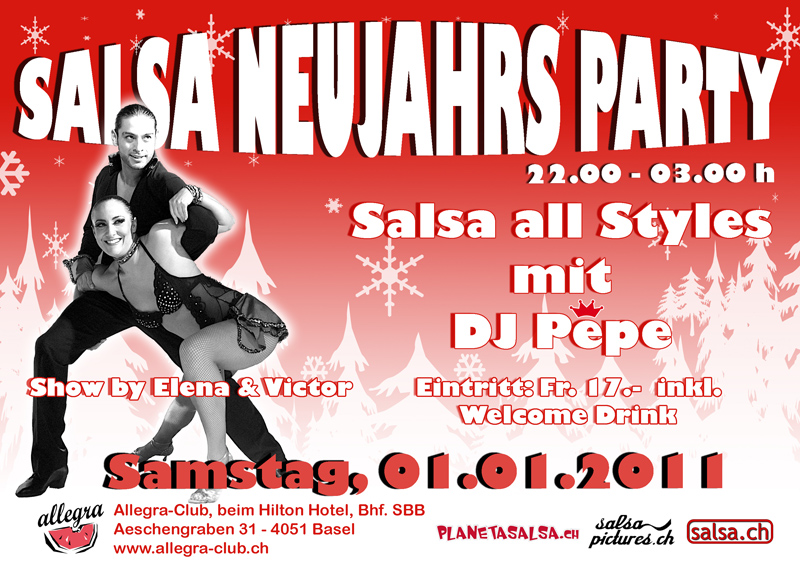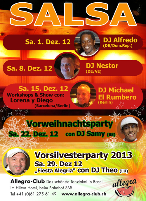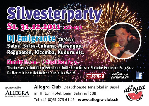 ![]() Unser Silvester Programm Wir öffnen um 22h unsere Türen und freuen uns mit Ihnen beschwingt ins neue Jahr zu starten. DJ Pepe wird mit Salsa- Merengue- Bachata- Kizomba- Latin Hits- Tropical Music etc. alle TänzerInnen in Schwung bringen. Wer nur zusehen möchte, kann sich einen ruhigen Tisch reservieren und die fröhliche Stimmung geniessen. Um 23.55h hält jeder Gast sein Glas in der Hand, wir stellen die Musik leiser und erwarten gemeinsam das Happy New Year 2014! Nach 24h offerieren wir ein kleines aber feines Fingerfood-Buffet mit Köstlichkeiten aus aller Welt. Unsere Reservierungsangebote: **Tischreservationen** 4 Personen: Eintritt, Garderobe und 1 Fl. Prosecco für CHF 140.- *** Uebernachtung im Hilton Hotel & Party im Allegra*** 2 Personen: Doppelzimmer & Eintritt an die Party für CHF 200.- (Checking ab 14h möglich). Anmeldung/Buchung bis Mo. 30.12. an: info@allegra-club.ch. 22h- open end Eintritt Fr. 25.- /Euro 20.- Cüplibon à CHF 5.- können an der Eingangskasse bezogen werden. |