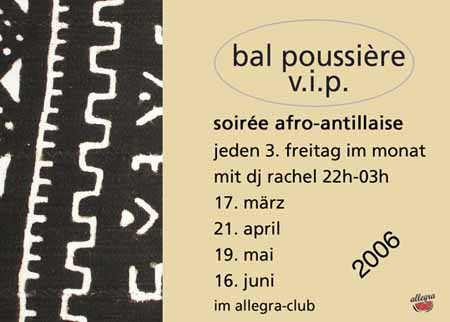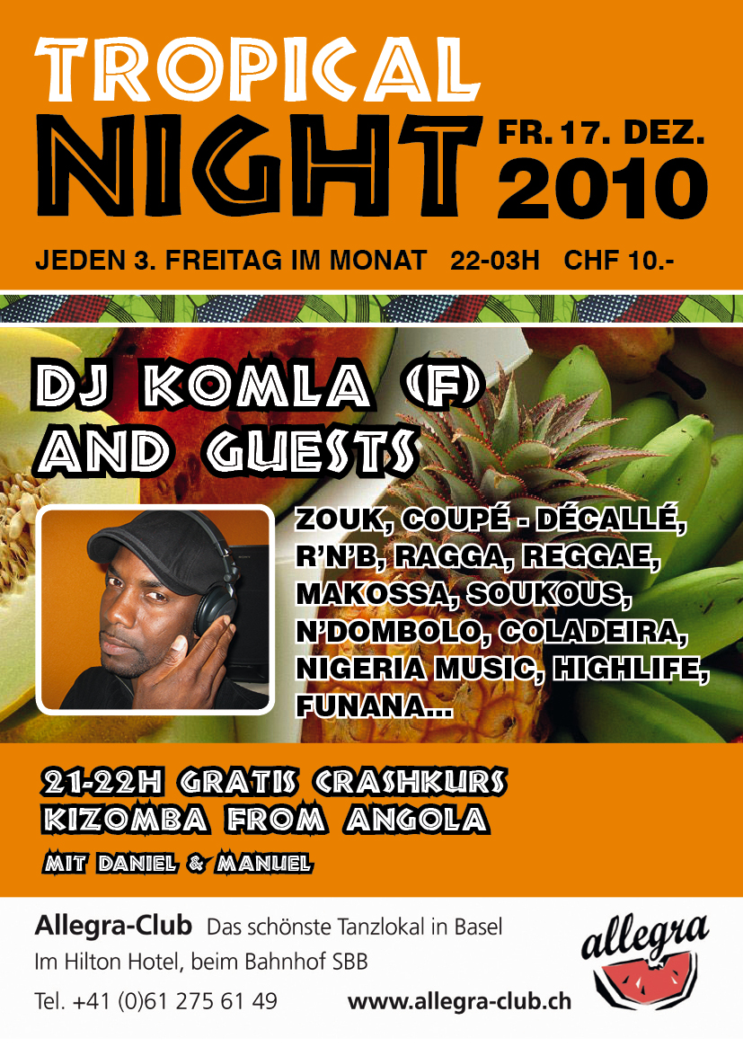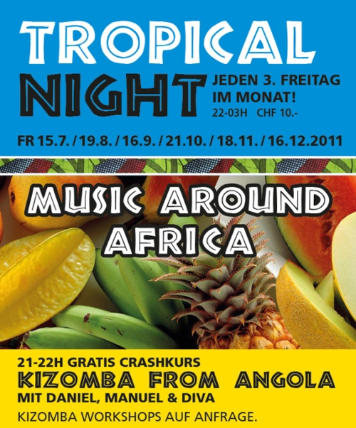 | Sommer- Special!! Freitag, 23. Juli von 22:00h bis-03:00h Eintritt Fr. 10.- Tropical-Night mit DJ Alphonse Zouk / Soukous / Calypso / Reggae / Raga / R’n’B Rai / Samba / Ndombolo / Mikalaka / Coladeira / Funana… ![]() |