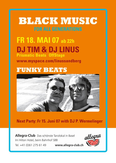 Freitag, 30. Mai 2008 21:00h bis 02:00h Disco mit den DJs Pietro & Stephan Showprogramm: Charleston Variation von "The Lindy Hop Dance Company" www.tickletoe.ch Rumba und Cha-Cha-Cha mit Alexa & Patrick ![]() |