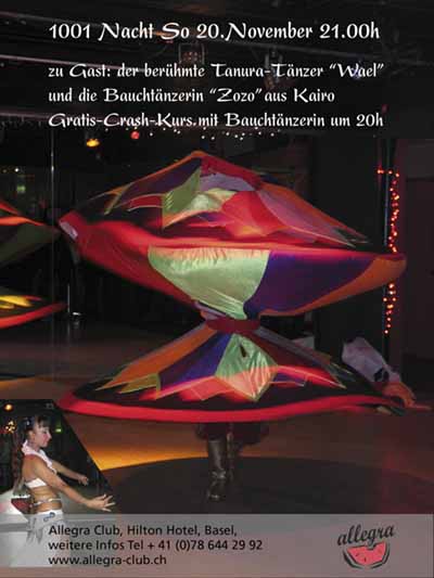 Freitag, 04. April 2008 Live Show mit Bauchtänzerin "Leyla" und Tanura Tänzer Gratis Crash-Kurs von 21h - 22h mit "Samira" mehr Infos: www.mashrabyia.ch ![]() Tanura Ein ägyptischer Derwischtanz. Tanura bedeutet Rock. Der Tanz ist religiösen Ursprungs und hat seine religiöse Symbolik bis heute behalten. Die Sonne symbolisierend, dreht sich der Tanura-Tänzer um seine eigene Achse, in unermüdlichen Kreisen wie die Derwische des Mewlana-Ordens. Zugleich können andere Tänzer drum herum die Sterne symbolisieren. Drehend löst der Tänzer einen Rock nach dem anderen und zieht ihn über den Kopf. Dort wird er zu einer Art Scheibe. Durch diese Scheibe scheint der Tänzer leicht zu werden und zum Himmel zu schweben. Der letzte Rock ist zweischichtig und entwickelt beim hochziehen den Effekt eines Balls, des Erdballs. Die Verbindung zwischen Himmel und Erde. ![]() ![]() |