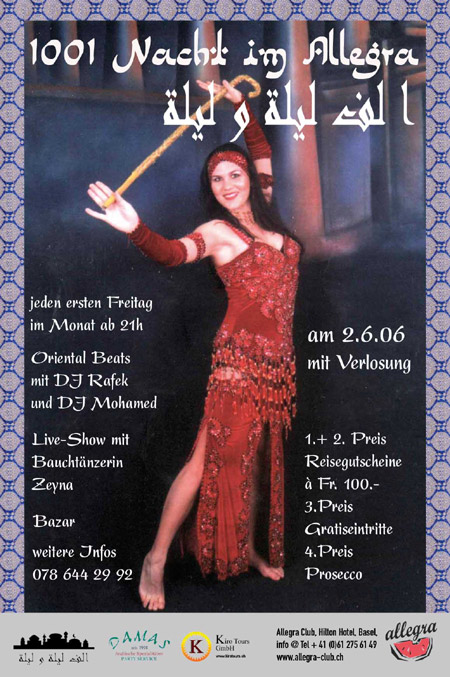 Freitag, 03. Juli 2008 Live-Show mit Bauchtänzerin "Zeyna" Gratis Crash-Kurs von 21:00h bis 22:00h ![]() Zeyna ist seit mehreren Jahren professionelle Tänzerin mit Leidenschaft. Sie gehört zu den beliebtesten Tänzerinnen in der Schweiz und wird ebenfalls im Ausland gerne gebucht. Nach ihrem Abschluss als Diplom-Sportpädagogin, Fachrichtung Tanz und Bewegungstheater, lebte sie ingesamt 3 Jahre als Tänzerin in Ägypten und Italien. Dort begeisterte sie nahezu täglich europäisches wie arabisches Publikum. Danach eröffnete sie die Arabesque Dance School, eine sehr erfolgreiche Bauchtanzschule in Zürich City. Dieses Jahr verbrachte sie 3 Monate in Mumbai, Indien, um sich in indischem Tanz (BOLLYWOOD DANCE) fortbilden zu lassen. Am 3. Juli zeigt Zeyna klassischen Orientalischen Tanz, einen Bollywood-Dance und eine spanisch-orientalische Fantasie. www.zeyna.com |