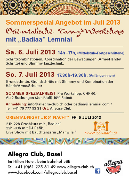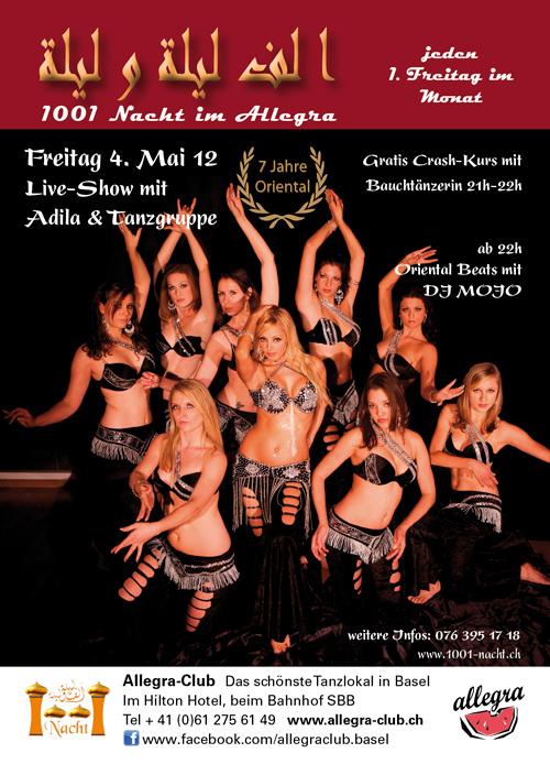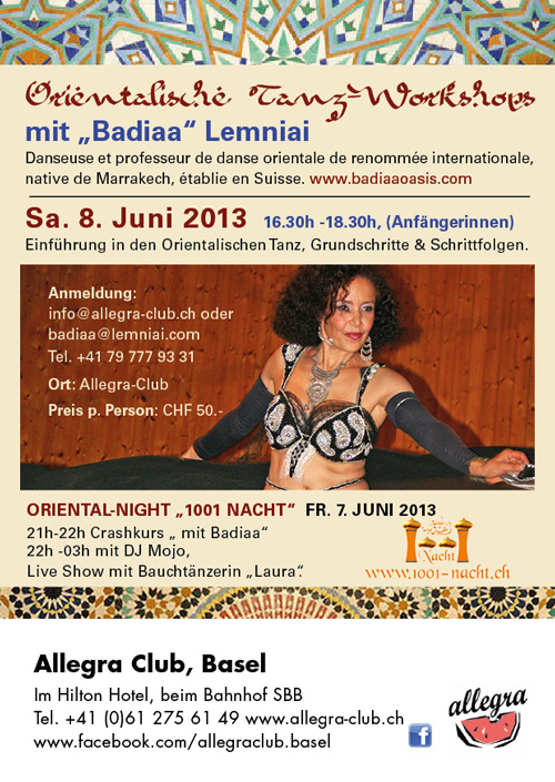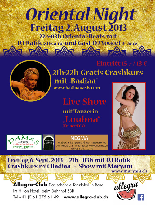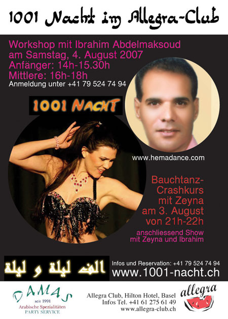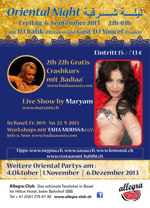 Freitag, 01. August 2008 Gratis Crash Kurs von 21h-22h mit der Bauchtänzerin „Nora“ Live Show mit der Bauchtänzerin „Nora“ ![]() Ich wurde 1980 in Luzern geboren. Durch mein künstlerisch geprägtes Elternhaus und insbesondere durch meine Mutter, die tunesisch-israelische Tänzerin Chaya Bukara, kam ich schon früh in Kontakt mit der orientalischen Kultur. So wurde meine Begeisterung für die verschiedensten Stilrichtungen des Tanzes geweckt, insbesondere für den orientalischen Tanz. weiter siehe: www.arab-elle.ch ![]() |
