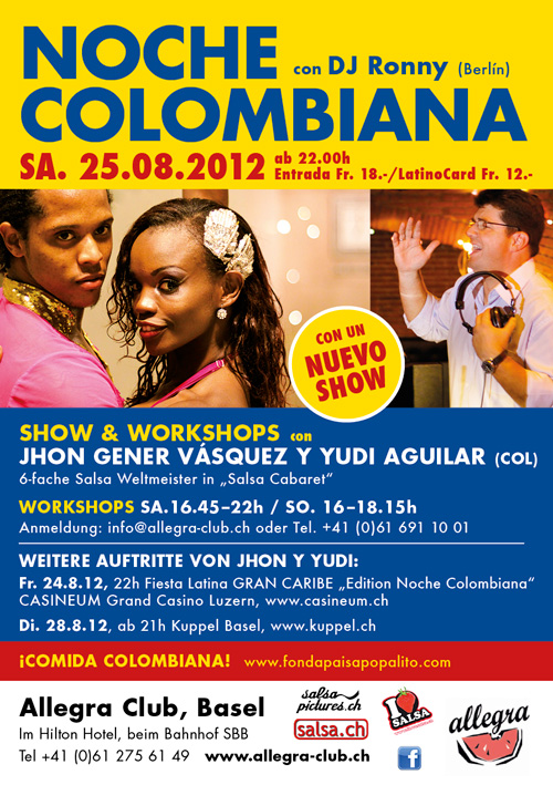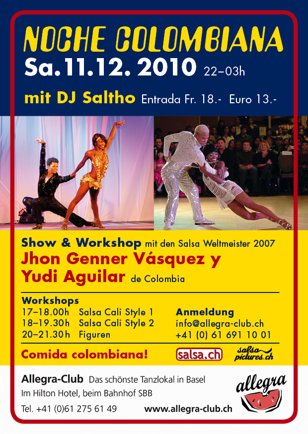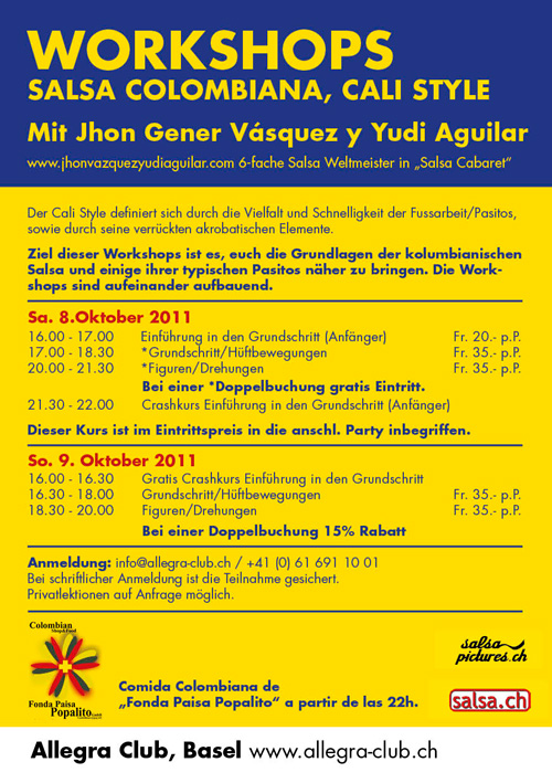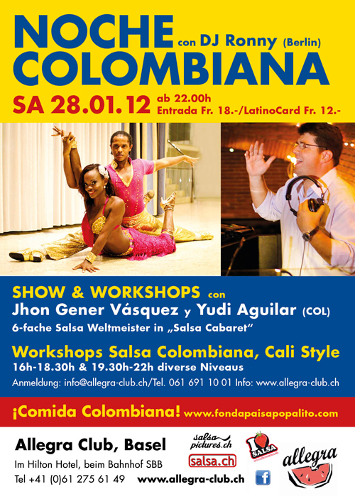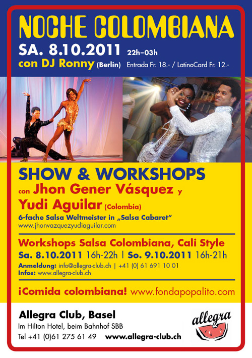 Workshop-Anmeldungen an: info@allegra-club.ch Jhon y Yudi sind nicht nur Weltklasse Tänzer, sondern auch sehr gute Tanzlehrer. Hier ein Beispiel einer „Masterklass“ in London 2011. RitmoLatino: „This workshop was full of fire! Cali Salsa At its best. John & Judy are probably the best salsa dance couple in the world. ![]() Salsa Colombiana: Der Cali Style definiert sich durch die Vielfalt und Schnelligkeit der Fussarbeit/Pasitos, sowie durch seine verrückten akrobatischen Elemente. Ziel dieser Workshops ist es, euch die Grundlagen der kolumbianischen Salsa und einige ihrer typischen Pasitos näher zu bringen. Boogaloo: Den nachhaltigsten Erfolg hat der Boogaloo jedoch in Kolumbien, wo er mit seinem schnellen Rhythmus als willkommene Alternative zur Cumbia gefeiert wurde. Die Gruppe La Sonora Carruseles nahm immer mal wieder Boogaloo in ihr Programm mit auf (Heavy Salsa (1998) – Salsa Brava/Salsa con Swing (2000)) und Grupo Galé feierte ihr zehnjähriges Bestehen mit „Boogalú con Galé“. http://de.wikipedia.org/wiki/Boogaloo / http://www.salsa-berlin.de/was-ist-boogaloo |