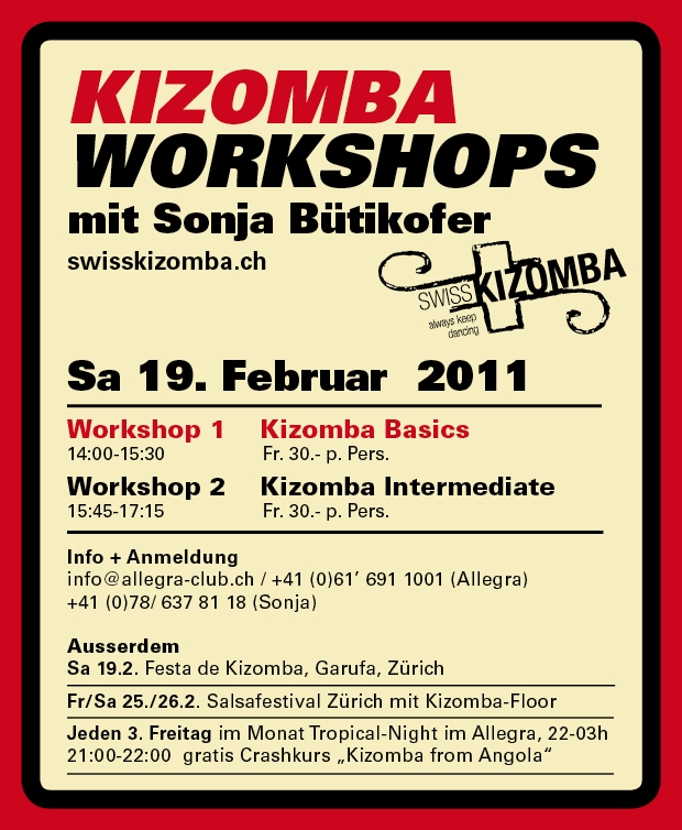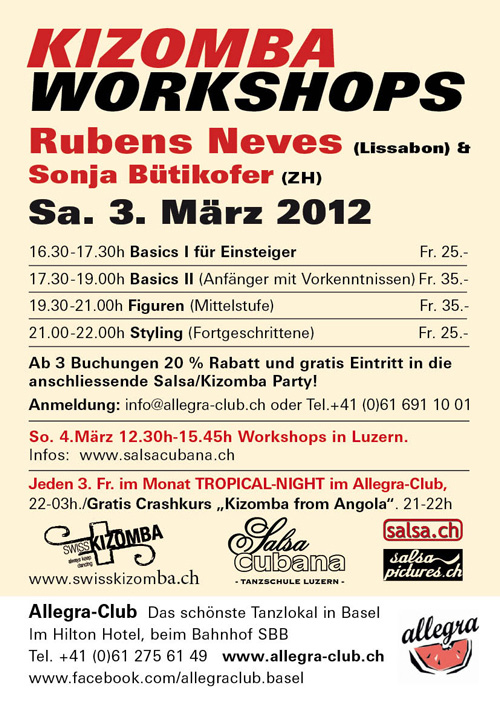 Samstag 24.Januar 2009 Salsa/Samba-Night mit DJ Plinio Show (Souk & Samba de Gafieira) der Tanzschule „salsalegria“ aus Zürich. 21:30h bis 22:00h Gratis Crash Kurs für unsere Gäste „Zouk Brasil“ mit Nancy von „salsalegria“ www.salsalegria.ch |