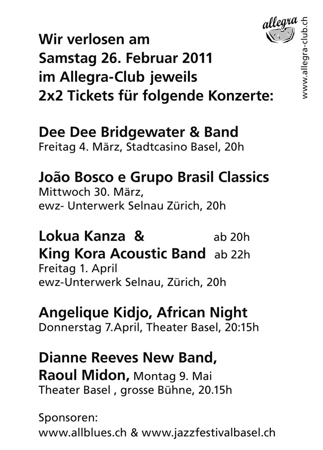 | Dank der ersten Koproduktion von Allegra und bird's eye jazz club findet in Basel vom September bis November das Brasil-Festival statt. | ||||||||||||||||||||||||||||||||||||||||||||||||||||||||||||||||||||||||