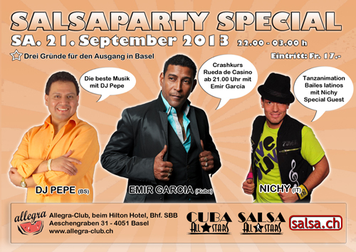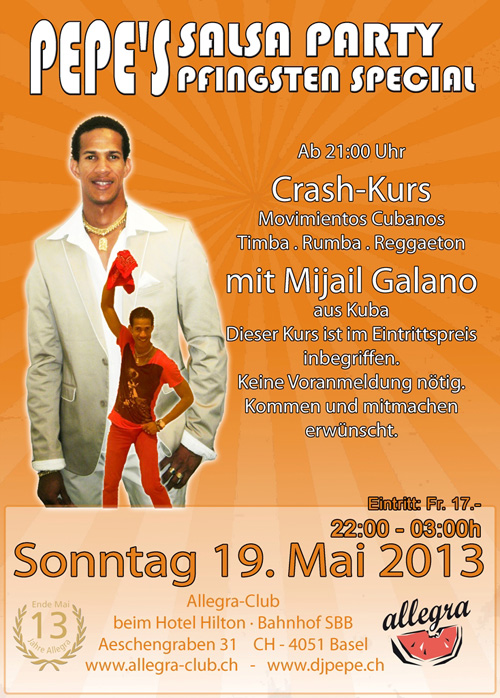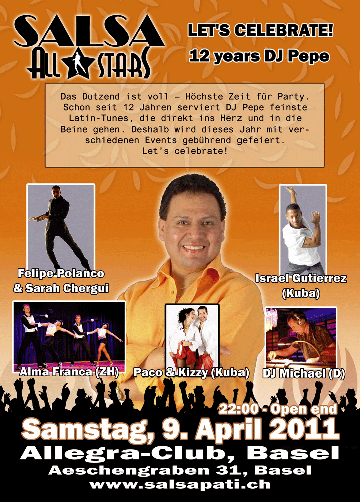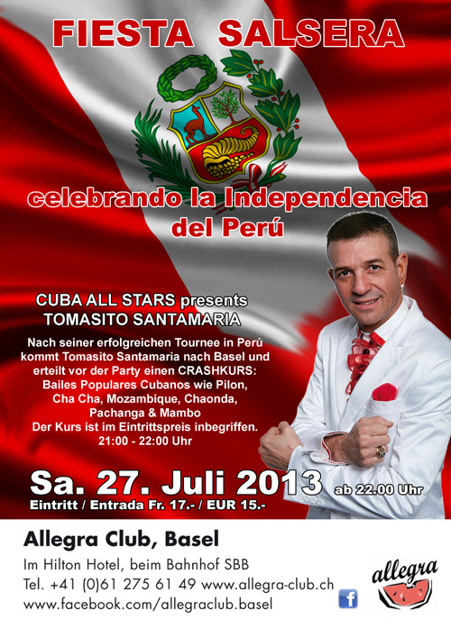 www.dastanzfest.ch TANZ IN BEIZEN & CLUBS 18h-21h Crashkurs „Standard & Latin mit Discofox & West Coast Swing mit Stephan Wagner www.tanzbarbinningen.ch 21h-22h Crashkurs „Salsa Cubana“ mit Alexis Rodriguez www.casadelamusica.ch Ab 22h Salsa Cubana Party con DJ Pepe & Animation con Alexis Rodriguez. Special Guest « Cuto Olaya » (Peru). ![]() |