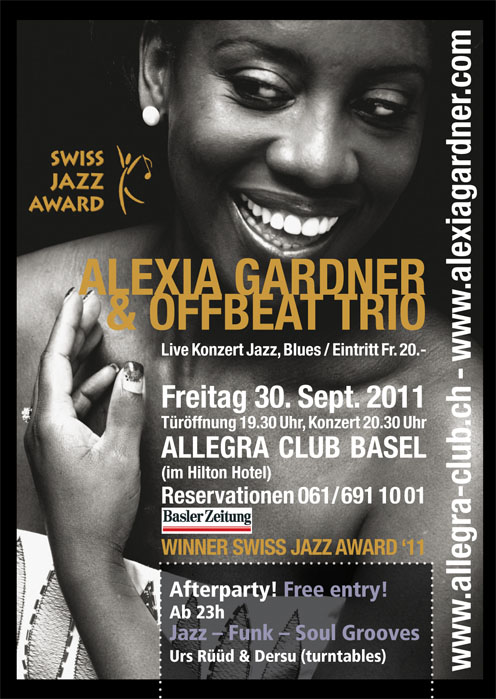 Sonntag, 31. Januar 2010 Jazzkonzert mit Alexia Gardner ![]() Alexia Gardner & offbeat Trio Vocal Jazz Mit Alexia Gardner wird eine herausragende Jazzsängerin präsentiert, die mit ihrer wunderschönen, warmen Stimme und ihrer temperamentvollen Art das Publikum sofort gewinnt. Alexia Gardner, mit jamaikanischen Wurzeln, ist in London aufgewachsen und lebt seit kurzem in der Schweiz. Vorher tourte und lebte sie über 10 Jahre in Südostasien mit unzähligen Auftritten in den angesagtesten Clubs, vor allem in Hongkong und Shanghai. Begleitet wird Alexia Gardner vom „offbeat Trio“. Swingend, subtil, dynamisch sind Marcel Schefer (Piano, St . Gallen), Kalli Gerhards (Kontrabass, Zürich) und Beat Fraefel-Haering (Schlagzeug, Wil) seit mehr als 13 Jahren ein eingespieltes klassisches Jazztrio - und gewinnen mit Ihrer Erfahrung immer noch an Spielfreude dazu. Die drei Musiker arbeiten neben ihrer Konzerttätigkeit als Musikdozenten an Jazz- und anderen Musikschulen ihrer Wohnorte. www.alexiagardner.com Nach dem Konzert d.h. ab 21:00h legt Urs Rüüd seine Platten auf Gratis Eintritt ab 21:00h ![]() Urs Rüüd Seine Vorlieben sind Jazz- und Black Music. Seine Musik ist funky (manchmal), swingt (meistens!) und bewegt sich spontan zwischen verschiedensten Musikstilen- und Epochen. Zu seiner Musik lässt sich reden, lachen, träumen – und gleichzeitig mit den Füssen wippen oder mit dem Kopf nicken. Tanzen? Aber sicher! – Probieren Sie’s!! Music for bars mit Urs Rüüd www.cargobar.ch |