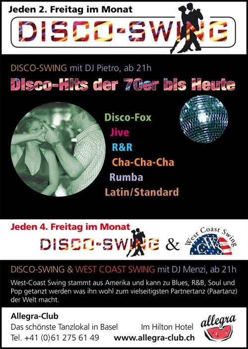 Freitag, 29. Mai Special Night Disco-Swing & Swingtime mit Shows 20:00h bis 21:00h: Gratis Crash Kurs für unsere Gäste „West-Coast Swing“ mit Rolf Menzi und Partnerin. Ab 21:00h Disco mit DJ Menzi (Zürich) Boogie Woogie Show von Sonja & Franky (Schweizermeister in Boogie Woogie) und Standard-Feeling Show der Rollstuhltanzgruppe „ Roll ‚n’ Go Dancers“ www.rollstuhltanz.ch
