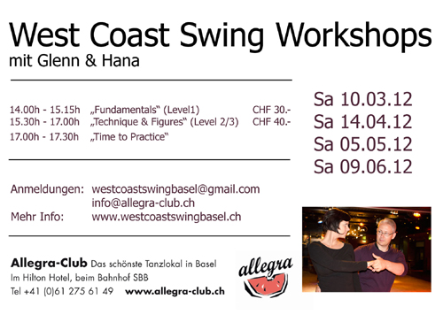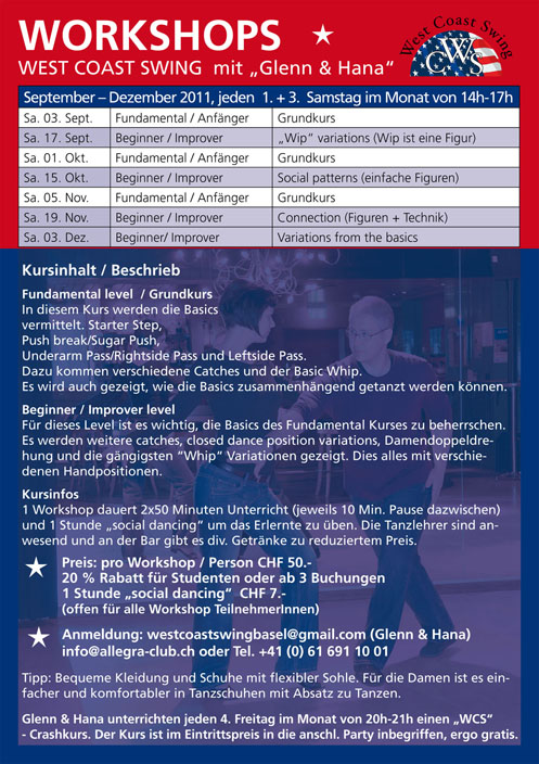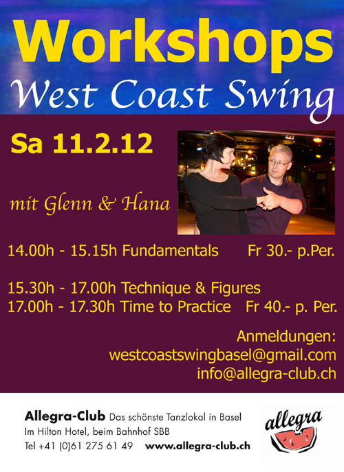 ![]() ![]() Biografie der Tanzlehrer Hana ist ursprünglich aus Ungarn und hat an zahlreichen Boogie-Woogie Turnieren in Ungarn und Europa teilgenommen. Seit 2007 nahm sie in London bei bekannten „Instructors“ aus UK und USA West Coast Swing Unterricht. Glenn stammt aus Schottland und erlernte das Tanzen vor über 10 Jahren. Den West Coast Swing erlernte er in Glasgow und später über 5 Jahre in London. Seit neustem lernt er „Tango Argentino“. Glenn und Hana sind verheiratet und leben seit 2010 in Basel. ![]() West Coast Swing (WCS) Fundamental and Beginner/Improver workshops in Basel! Come and learn America’s favourite dance at the Allegra-Club! Fall Sie noch keine Erfahrungen mit West Coast Swing gemacht haben, sind unsere Workshops eine einmalige Gelegenheit herauszufinden, was diesen modernen Partnertanz so populär und faszinierend macht. West Coast Swing ist mit seinen geschmeidigen Bewegungen nicht nur sexy und „stylish“, er bietet auch viele Möglichkeiten die Musik vielseitig und interessant zu interpretieren. Dieser aus Amerika (Westküste) stammende Partnertanz sieht cool aus und vermittelt ein elastisches Gefühl. Der Focus dieses Linientanzes liegt im Zusammenspiel der Partner, der Improvisation und der Musikinterpretation. West Coast Swing kann zu verschiedenster Musik getanzt werden; von Blues - R&B und Soul- Pop, was ihn wohl zum vielseitigsten Partnertanz der Welt macht. West Coast Swing bietet Anfängern eine super Möglichkeit sexy und kecke Bewegungen zu erlernen und für erfahrene Tänzer ist es die Gelegenheit ihren Disco Swing auf einen höheren Level zu bringen. |