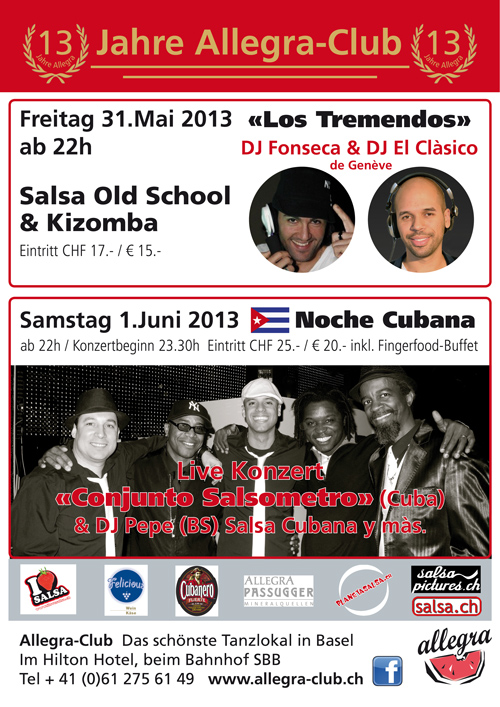 jetzt erst recht "das schönste Tanzlokal in Basel". Wir freuen uns auf den Neustart mit vielen BesucherInnen, Tänzer oder Nichtänzer, jeder Gast ist bei uns herzlich willkommen. Barbara Hauser und ihr Team. Wir haben es geschafft! Der Allegra-Club erstrahlt in neuem Glanz. Zur Eröffnungsfeier am Do. 4.10. offerieren wir ein Cüpli oder O-Saft und servieren was zum knabbern. Die Tanzschule Fusión Caribe (www.fusioncaribe.com) ist am Abend auch mit von der Partie. Die Tanzlehrer Katja Savastano & Rafael Gonzalez werden mit ihrer beliebten Rueda und Animation kräftig einheizen und mit ihren Schülern und Schülerinnen und allen Allegra-Gästen für super Stimmung sorgen. Am Sa. 6.10. verlosen wir 10 Konzert /Event-Tickets. Je 2 Tickets für: • "El Gran Combo" de Puerto Rico (Fr. 12.10. in Zürich), Sponsor DJ El Mono • Timba Live Orquesta (Fr. 2.11. im Salsarica ZH), Sponsor DJ Theo Terzis Folgende 6 Tickets wurden von www.actnews.ch gesponsert. Herzlichen Dank für diese Grosszügigkeit. • Chippendales (So. 21.10. Stadtcasino Basel) http://www.actnews.ch/events/details/event/chippendales/ • Irish-Folk-Festival (Sa. 27.10. Stadtcasino Basel) http://www.actnews.ch/events/details/event/irish-folk-festival/ • Dieter Thomas Kuhn (Do. 1.11. Volkshaus Basel) http://www.actnews.ch/events/details/event/dieter-thomas-kuhn-amp-band/ Bei folgenden Sponsoren bedanken wir uns für Ihre Unterstützung: www.allegra-passugger.ch , www.felicious.ch , www.uehlingerag.ch , www.wenckeschmid.ch www.salsa.ch , www.flyerking.ch und www.iwb.ch. Ein grosses Dankeschön an alle Handwerkerfirmen und Mitarbeiter, welche unter grossem Zeitdruck die Wiedereröffnung am Donnerstag ermöglichten; www.nassag.ch, www.boden-jost.ch , www.atelier111.ch , www.brobst.ch und www.marcel-fischer.ch. Last but not least meinen MitarbeiterInnen die mir zur Seite standen. Wir freuen uns wieder GastgeberInnen zu sein. Wir sind's wieder; das schönste Tanzlokal in Basel. Barbara Hauser und das Allegra-Team. |