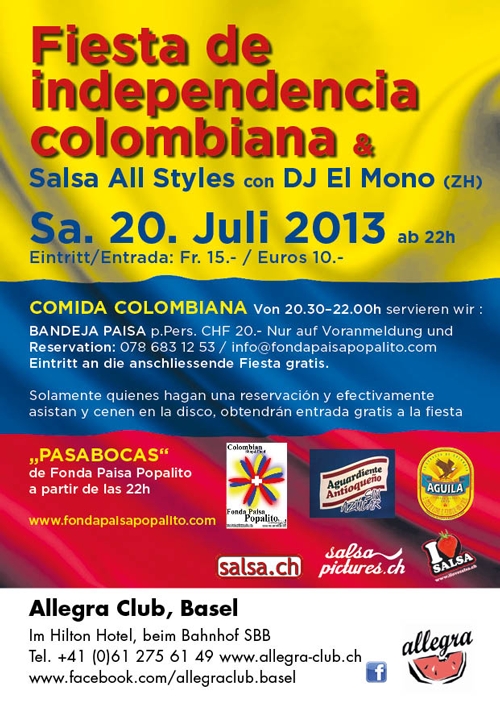 Lastimosamente Jhon y Yudi, los bailarines anunciadospara nuestra fiesta, no podrán venir a Suiza, debido a que sus documentos de emigración no fueron aprobados. Nos esforzamos en organizar una pareja de baile para reemplazarlos, pero en tan corto tiempo no lo logramos. Sin embargo, la Noche Colombiana con DJ El Mono se llevará a cabo. Para esa noche, como ya informamos, Martha de www.fondapaisapopalito.com brindará deliciosa comida colombiana y Patricia de www.nayandei.ch, ofrecerá placenteros masajes en los pies.
