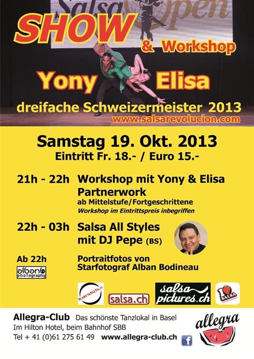 Moderiert werden die Tanz-Shows durch den Resident-Tanzlehrer des Allegra-Clubs, Ernesto Krämer, der zusammen mit Sonia Ferreiro jeweils donnerstags im Allegra-Club Salsakurse auf drei Stufen unterrichtet. Mehr Infos zu unseren eigenen Tanzkursen, inkl. Gratis-Schnupperkurs bitte hier klicken. |